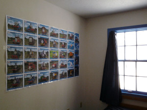 無料ダウンロードできるミニキャラクターポスターは、「きかんしゃトーマス」公式サイトにあって、たまーにダウンロードして子供たちと楽しんでました。それんなんで、今回は全36キャラクターをプリントして、それを糊で貼りあわせて特大コラージュポスターを作ってみたわけです。プリントする過程からコラージュを作る過程まで、子供たちと一緒にやったので、子供たちはもう大喜び!特にM君は、3歳から続いてる夜泣き(夜中12時と4時に必ず起きる!涙)があるので、彼のベット側の壁に飾って「夜泣き防止」になるかな?って。本人も「これでもう夜は怖くない!」って言ってたけど、実際はあまり効果は見られず。。。。(笑)
